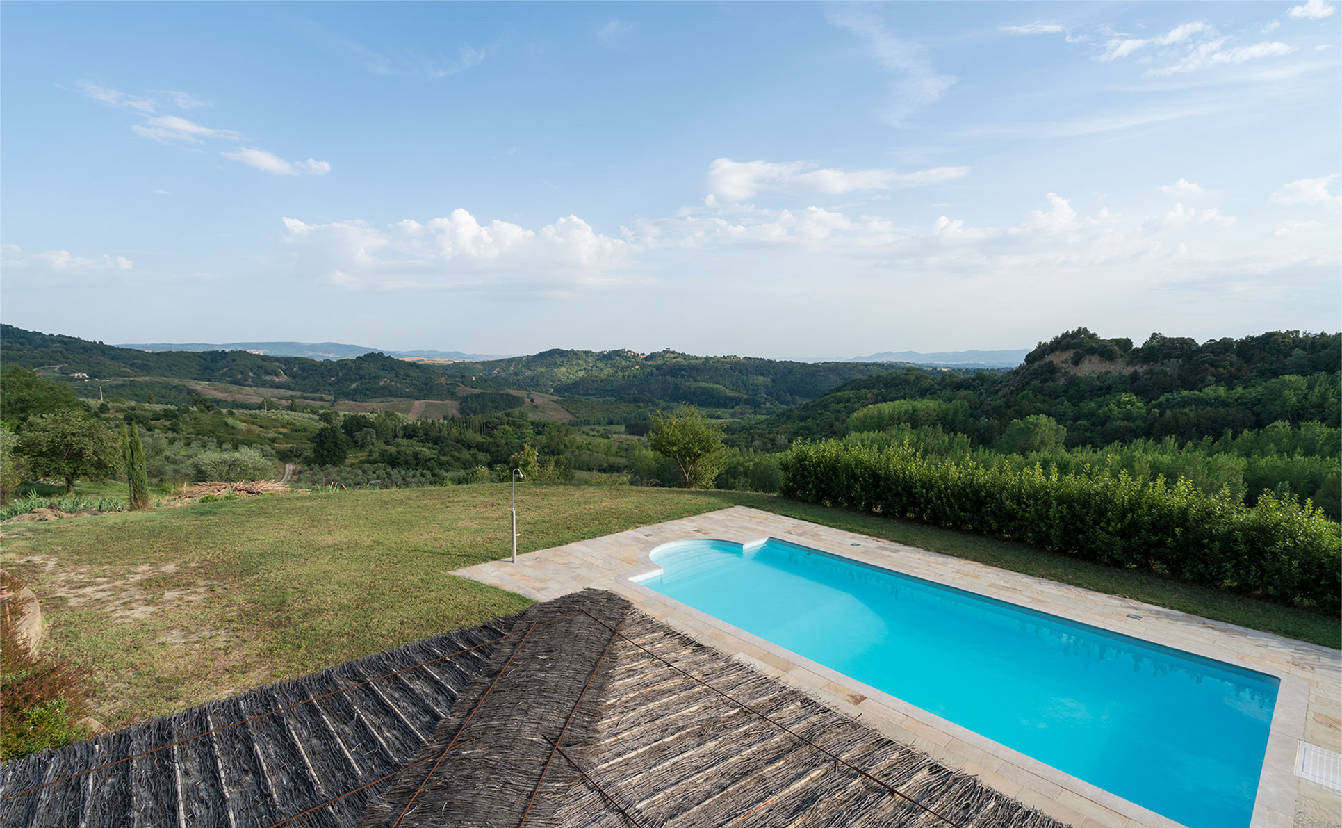 Die weitläufige, schön gestaltete Anlage ist mit ausreichend Liegestühlen, Sonnenschirmen und als besonderem Komfort einem überdachten Poolhaus mit WC und Waschbecken ausgestattet, das für die heißen Stunden des Tages ausreichend Schatten spendet und das auch als Umkleide zur Verfügung steht.
