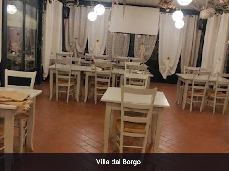 - Villa dal Borgo direkt in Palaia, ca. 2 km entfernt – vor der Turmdurchfahrt gleich rechts, Pizza und Pasta, im Sommer am Wochenende öfter Livemusik, Karaoke, Theater, Hüpfburg für Kinder. Via delle pieve, 56036 Palaia, Tel. +39 340 3896760 (montags geschlossen)