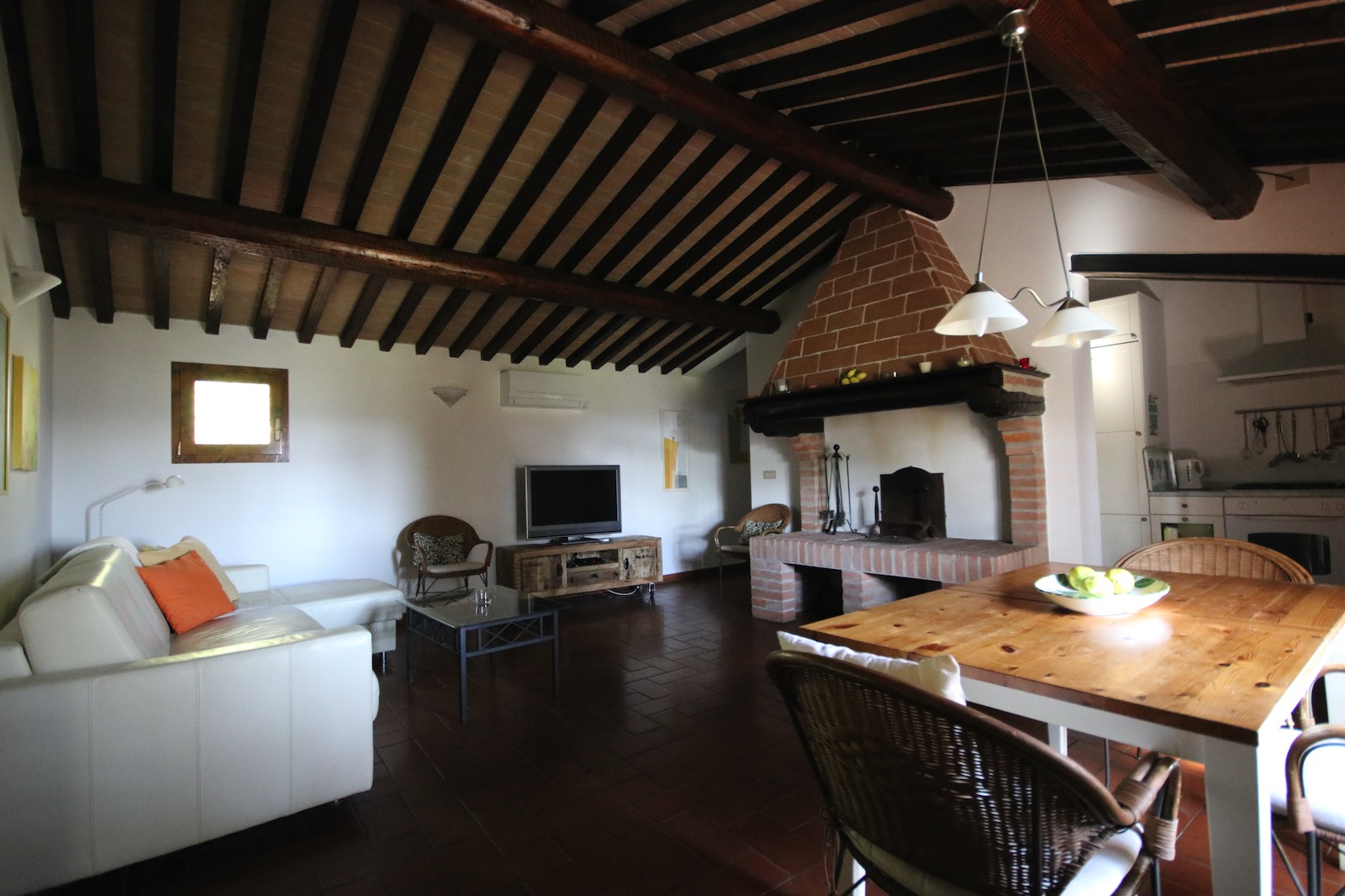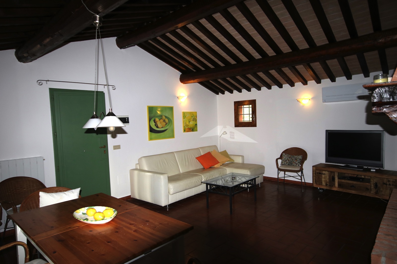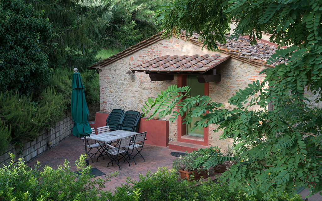 Das langgestreckt in den Hügel eingebettete Haus besitzt zwei voneinander unabhängige Wohnungen, von denen eine zeitweise ausschließlich privat genutzt wird. Eine große Terrasse, uneinsehbar von der zweiten Wohnung aus, steht ausschließlich den Gästen des Apartments Limone zur Verfügung. Die friedvolle Stille, das unvergleichliche Panorama, das Zirpen der Zikaden, der Gesang der Nachtigall und in den Frühsommermonaten auch das Leuchten der Glühwürmchen lässt sich von hier aus besonders entspannt genießen. Apartment Limone ist sehr komfortabel und mit liebevollen Details ausgestattet – auch eine Klimaanlage sorgt in den heißen Sommermonaten für die Bequemlichkeit unserer Gäste. Ansonsten ist die Ausstattung stilsicher dem urwüchsigen Charakter des über 100 Jahre alten bäuerlichen Anwesens angepasst.