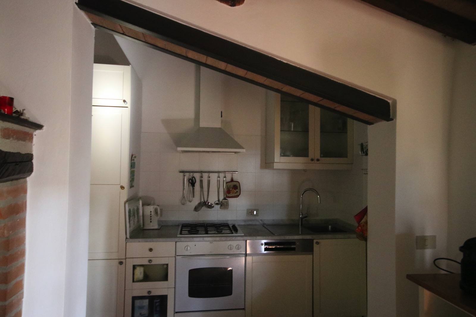 Kücheneinbauzeile mit 4-Flammen-Gasherd und Elektrobackofen, Spülmaschine, deutsche und italienische Kaffeemaschine, Wasserkocher, Toaster, großer Kühlschrank mit Eisfach, komplettes Geschirr mit Zubehör und Küchenwäsche