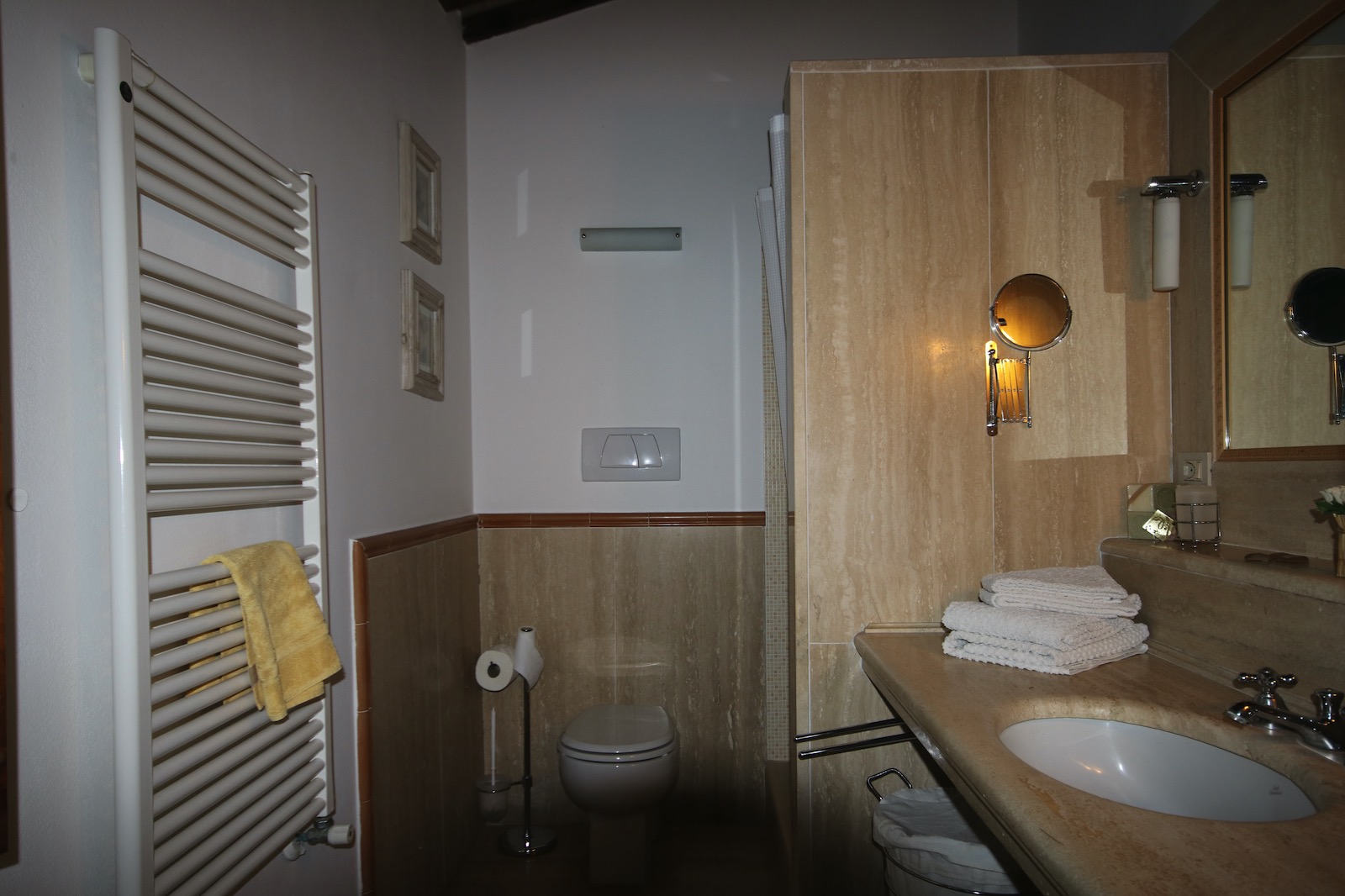 Eingebautes Waschbecken mit großzügiger Ablage und Regalen aus Travertino-Marmor