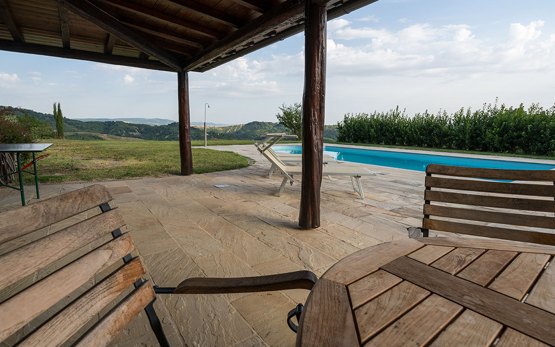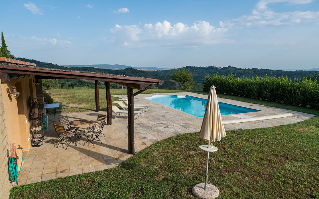 Die weitläufige, schön gestaltete Anlage ist mit ausreichend Liegestühlen, Sonnenschirmen und als besonderem Komfort einem überdachten Poolhaus mit WC und Waschbecken ausgestattet, das für die heißen Stunden des Tages ausreichend Schatten spendet und das auch als Umkleide zur Verfügung steht.